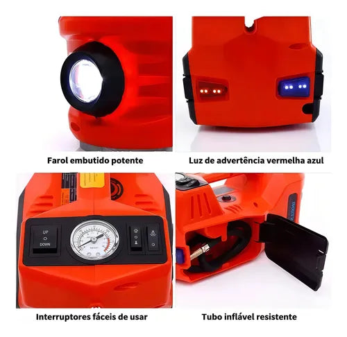 - Kit 3 em 1: macaco elétrico, bomba de ar automática e chave de impacto elétrica.